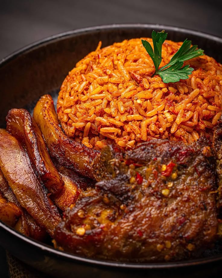 Our signature Jollof Rice paired with sweet Fried Plantain and a side of tender Chicken.